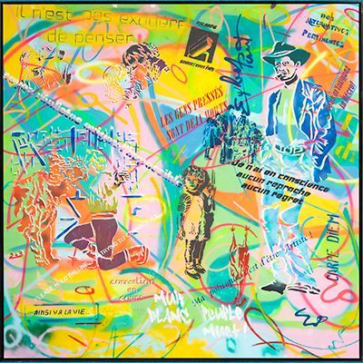Inventeur dans l’art urbain du pochoir en couleur à partir de 1983, l’artiste inspira par ses pochoirs un élan esthétique majeur dans la forme et profond dans le discours. C’est en magicien de la couleur par des fonds abstraits et lyriques.