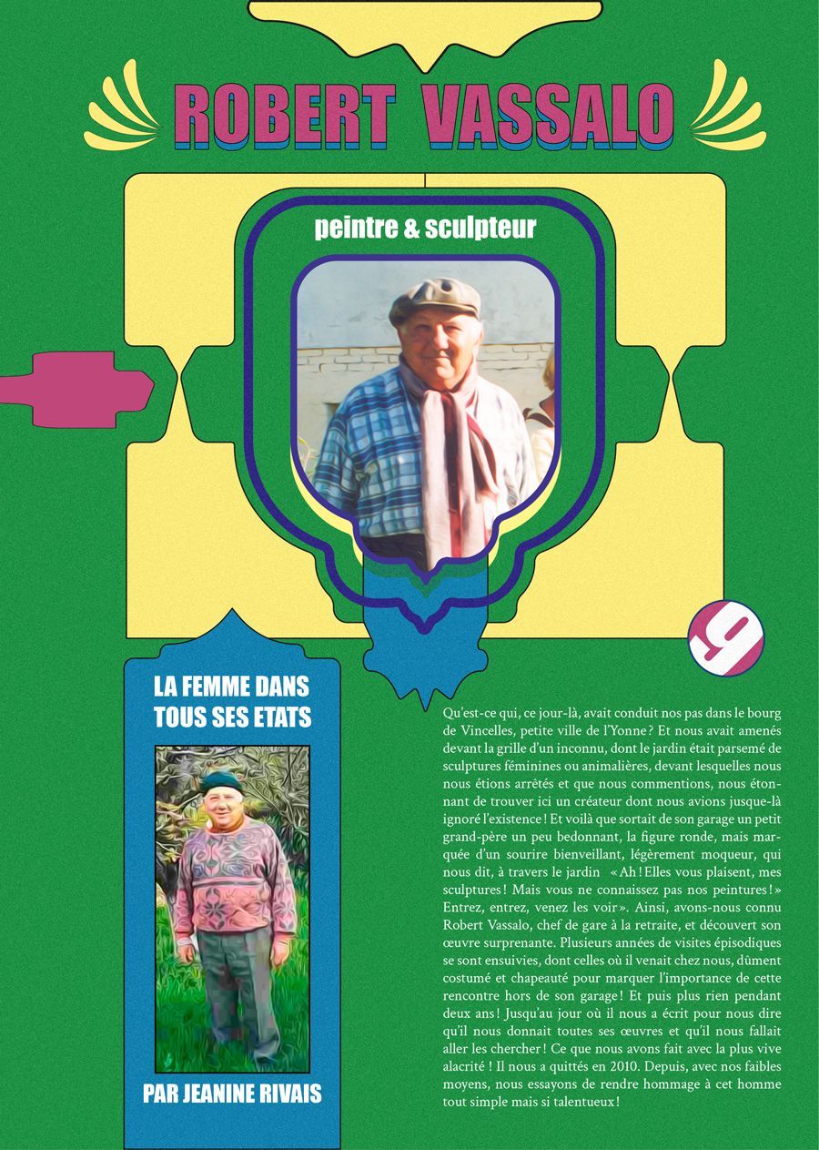 Jour 8 : Page 8 et 9 du prochain numéro de la Revue Trakt, Robert Vassalo par Jeanine Rivais. Qu’est-ce qui, ce jour-là, avait conduit nos pas dans le bourg de Vincelles, petite ville de l’Yonne ? Et nous avait amenés devant la grille d’un inconnu, dont le jardin était parsemé de sculptures féminines ou animalières, devant lesquelles nous nous étions arrêtés et que nous commentions, nous étonnant de trouver ici un créateur dont nous avions jusque-là ignoré l’existence ! Et voilà que sortait de son garage un petit grand-père un peu bedonnant, la figure ronde, mais marquée d’un sourire bienveillant, légèrement moqueur, qui nous dit, à travers le jardin « Ah ! Elles vous plaisent, mes sculptures ! Mais vous ne connaissez pas nos peintures ! » Entrez, entrez, venez les voir ». Ainsi, avons-nous connu Robert Vassalo, chef de gare à la retraite, et découvert son œuvre surprenante. Plusieurs années de visites épisodiques se sont ensuivies, dont celles où il venait chez nous, dûment costumé et chapeauté pour marquer l’importance de cette rencontre hors de son garage ! Et puis plus rien pendant deux ans ! Jusqu’au jour où il nous a écrit pour nous dire qu’il nous donnait toutes ses œuvres et qu’il nous fallait aller les chercher ! Ce que nous avons fait avec la plus vive alacrité ! Il nous a quittés en 2010. Depuis, avec nos faibles moyens, nous essayons de rendre hommage à cet homme tout simple mais si talentueux ! la suite ici...